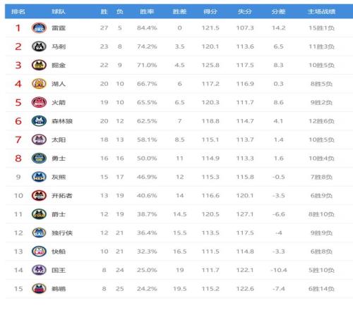 雷霆赢球后结束2连败,战绩27胜5负排名西部第一,也是联盟第一。