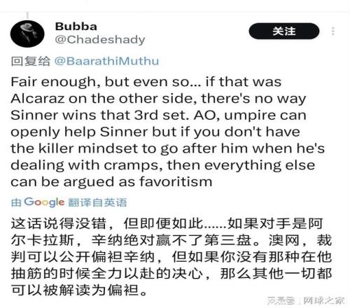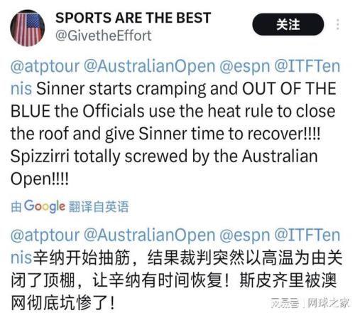 斯皮泽里的支持者们愤怒地指出,暂停恰好出现在辛纳最脆弱的时刻,这“过于巧合”地拯救了意大利人。社交媒体上,“规则干扰势头”的讨论迅速升温。有网友尖锐指出:“如果这是足球比赛,对手受伤倒地后重新开球,受伤方球员会立刻将球踢出界外以示体育精神,但网球规则没有这样的传统。”