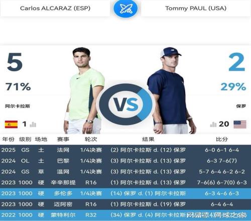 2026赛季,保罗伤愈复出。先在ATP250布里斯班站首战告负,再在ATP250阿德莱德站连胜两场闯进四强。澳网开幕之后,状态渐好的保罗连胜三场,迎来了与阿尔卡拉斯职业生涯的第八次交锋。曾经以巡回赛西班牙选手的克星而著称的保罗,刚刚在2026年澳网第三轮战胜了一名西班牙选手福基纳,紧接着就在第四轮1/8决赛对阵另一名西班牙选手阿尔卡拉斯。那么,本赛季伤愈复出的世界排名第20位的保罗,将会给阿尔卡拉斯造成多大的麻烦呢?而志存高远的世界第一阿尔卡拉斯,又将怎样为西班牙选手正名呢?明天上午,就见分晓。