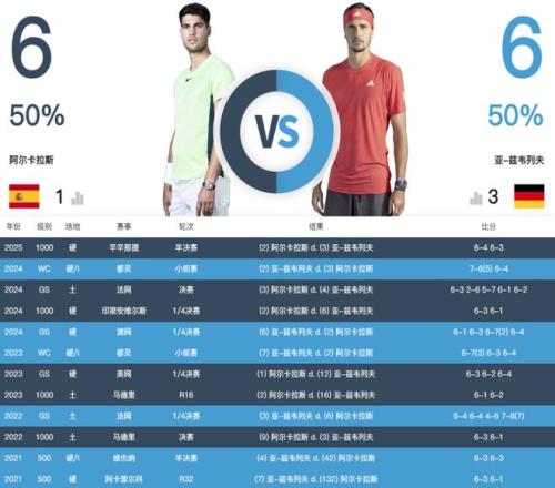 回看两人过往的交锋史,双方各胜六场看似旗鼓相当,但这似乎也包含了不小的迷惑性。因为在西班牙人火力最为凶猛的2025赛季,两个人仅在辛辛那提大师赛半决赛有过一次交锋,那场比赛面对已经升级到2.0版本的阿尔卡拉斯,兹维列夫谈不上有太多机会。6-4 6-3的比分也只是数据上的体面。