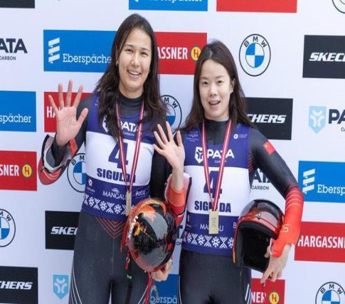 古丽洁乃提·阿迪克尤木(左)/赵佳颖在第十四届全国冬季运动会上摘得女子双人雪橇冠军。