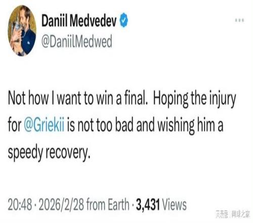 “这不是我想赢得决赛的方式,”梅德韦杰夫在确认对手退赛后,于X平台发文写道,“希望格里克斯普尔的伤势不重,祝他早日康复” 。这位30岁的俄罗斯名将整届赛事未失一盘,用完美的表现等待着一个本应完美的句号,却等来了意外的退赛大礼和窗外呼啸的防空警报。