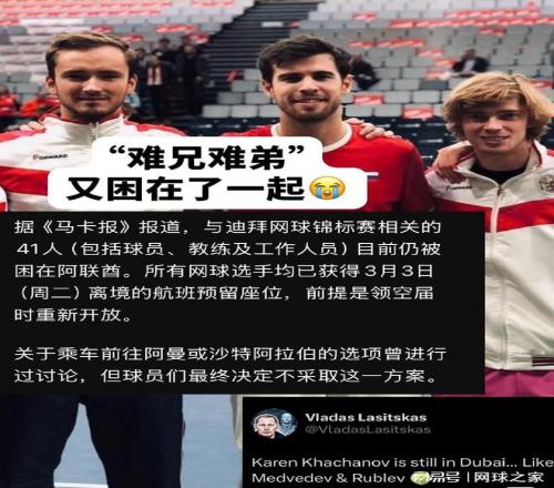 据《马卡报》报道,目前ATP被困于迪拜的人员多达41人,包括球员、教练、赛事工作人员等等。