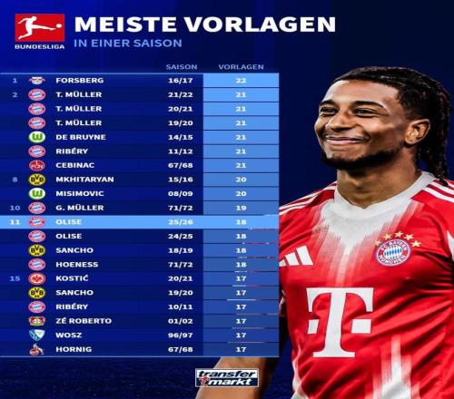 北京时间2月21日,来自德转的统计指出,拜仁慕尼黑边锋奥利塞距离德甲历史单赛季的助攻数纪录还有4次之遥。