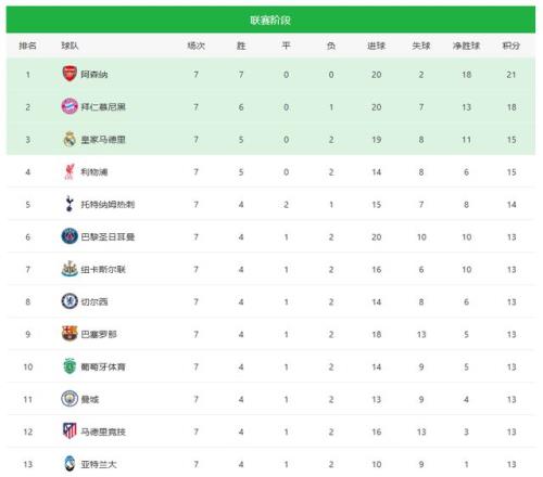 2025-26赛季欧冠联赛阶段前7轮,6-13位竞争极为惨烈,巴黎圣日耳曼、纽卡、切尔西、巴萨、葡萄牙体育、曼城、马竞、亚特兰大8支球队,都是拿到13分,杀得昏天暗地。