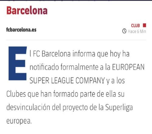 巴萨官方:已正式通知欧超公司及成员俱乐部,将退出欧超项目