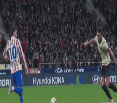 第14分钟,格子的神勇状态,灵巧的身姿展现出来。他得球后在禁区内换到左脚射门,低射,入网。马竞2-0领先!