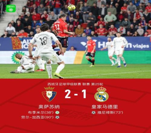 北京时间2月22日西班牙足球甲级联赛 联赛 第25轮,奥萨苏纳主场对阵皇家马德里。奥萨苏纳布季米尔破门,劳尔-加西亚破门。皇家马德里维尼修斯破门。最终比分奥萨苏纳 2-1 皇马。