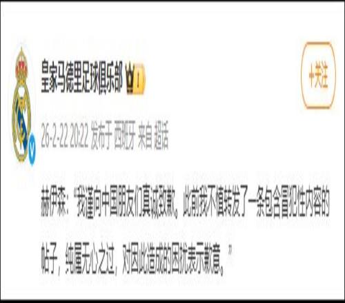 2月22日晚,西班牙皇家马德里足球俱乐部球员赫伊森就社交媒体发布辱华贴文一事,向中国网友道歉。