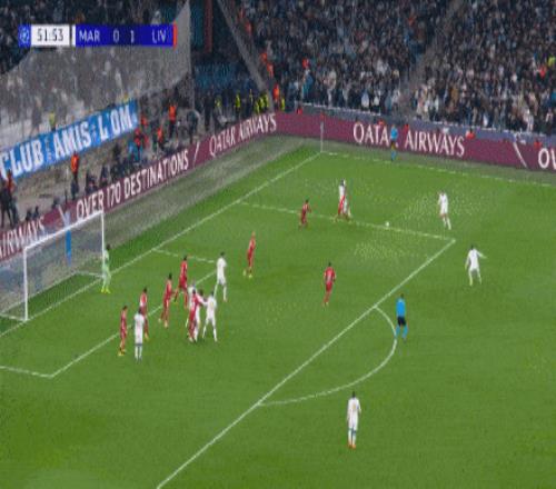 半场补时第2分钟,索博斯洛伊主罚前场任意球,选择直接贴地斩破门,利物浦1-0马赛。