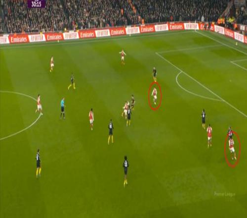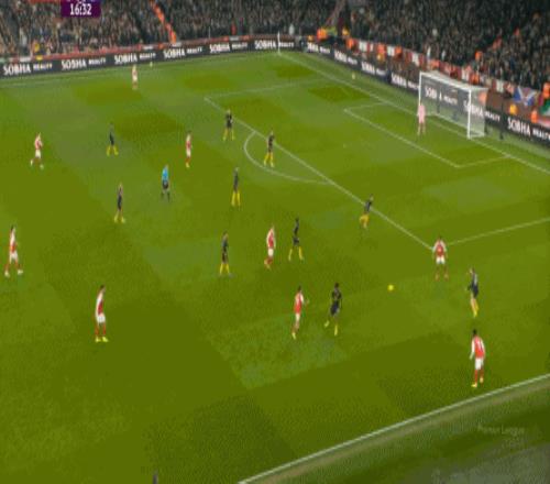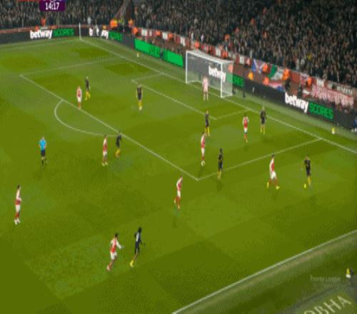但这次进攻成型也有偶然性,因为阿森纳这一侧的中场和边后卫全部随着进攻球员压上去了,这是反击能出现的关键: