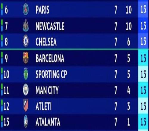 欧冠联赛阶段最后一轮18场同开,赛前6-13名的八支球队同积13分,对前八的直通名额展开了激烈争夺。不过半场过后,八支球队里仅曼城取得了领先。