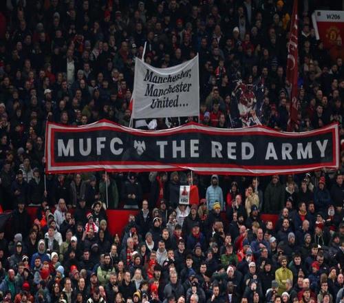 当地时间2025年12月30日,英国曼彻斯特,老特拉福德球场,英超比赛前,曼联球迷举着横幅。视觉中国 图