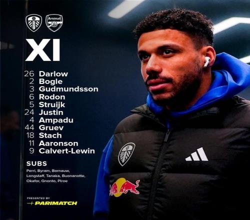 利兹联首发:26-达洛、2-博格尔、3-古德蒙松、6-乔-罗顿、5-斯特鲁伊克、24-詹姆斯-贾斯廷、4-阿姆帕杜、44-格鲁耶夫、18-施塔赫、11-阿伦森、9-卡尔弗特-勒温