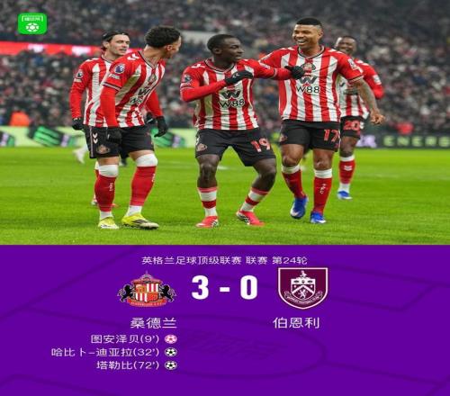 北京时间2月3日英格兰足球顶级联赛 联赛 第24轮,桑德兰主场对阵伯恩利。桑德兰哈比卜-迪亚拉破门,塔勒比破门。伯恩利图安泽贝自摆乌龙。最终比分桑德兰 3-0 伯恩利。