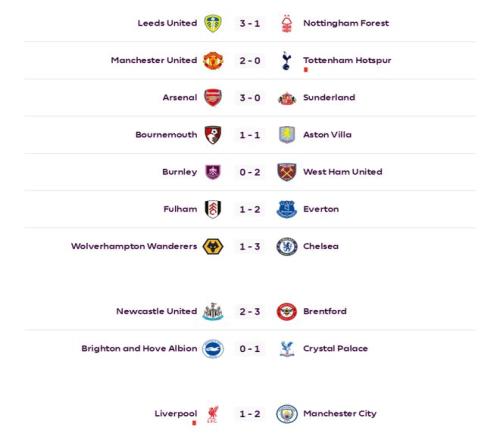 北京时间2月9日凌晨,随着本轮焦点战利物浦主场遭曼城绝杀,英超第25轮十场比赛全部战罢。阿森纳3比0完胜桑德兰,继续6分领跑英超;曼城凭借哈兰德93分钟的制胜点球2比1力克利物浦,坐稳次席,领先本轮打出平局的维拉3分;曼联2比0击败热刺,继续排名第四,距离维拉3分;切尔西3比1击败狼队,领先本轮输球的利物浦4分,两队分列第五、第六。