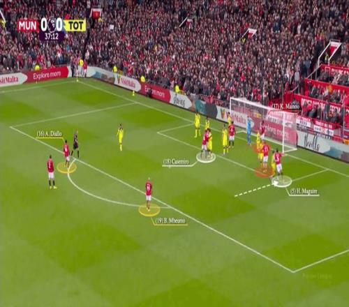 热刺只有哈维·西蒙斯一人防守禁区前,而曼联安排了阿马德、姆贝莫和迪奥古·达洛站在那里。阿马德佯装去接B费开战术角球,带走了西蒙斯,结果实际接应的是梅诺,姆贝莫得以获得充足的射门空间。
