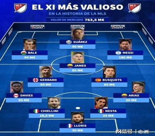 德转列美职联球员、以及曾在美职联效力的球员身价最贵阵,梅西1.8亿欧领衔,苏亚雷斯、贝尔、杰拉德、J罗、布斯克茨在列,中卫组合则是基耶利尼+内斯塔。