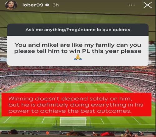 阿尔特塔的妻子Lorena在IG上发图文回应了球迷的提问,这名球迷表示“你能不能告诉阿尔特塔,请拿下今年的英超冠军”。