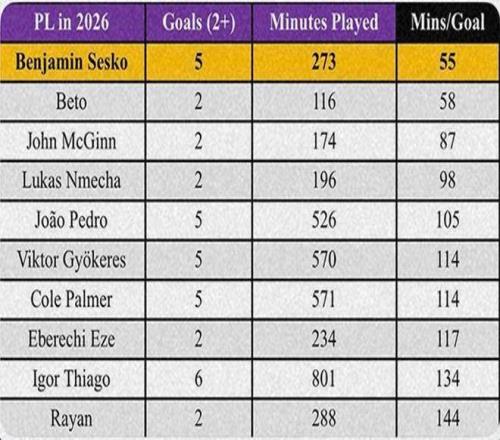 在卡里克执教的第6场比赛中,被看好首发的谢什科仍然作为替补出场。其他同龄球员可能因此闷闷不乐,但这位斯洛文尼亚前锋选择不发表怨言,而是用表现来说话。7次出场打入6球,谢什科成为英超状态最好的射手之一,2026年还没有哪位球员在英超的非点球进球数超过他的5个。