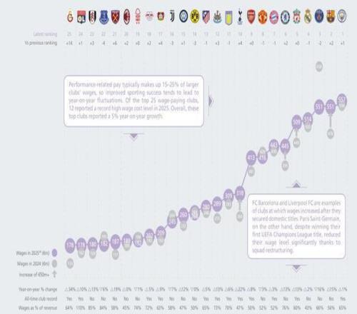 北京时间2月26日,欧足联官方公布了2025年各俱乐部的财政与投资报告,在报告中公布了各俱乐部薪资支出的前25名,曼城以5.57亿欧元的工资支出排名第一,巴萨第二,巴黎第三,皇马第四。