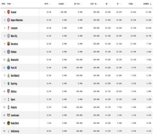 欧冠夺冠概率:阿森纳27.48%断层领先!拜仁排第二,皇马仅第九