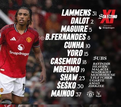 曼联首发:31-拉门斯、2-达洛特、5-马奎尔、8-布鲁诺-费尔南德斯、10-库尼亚、15-约罗、18-卡塞米罗、19-姆伯莫、23-卢克-肖、30-谢什科、37-梅努