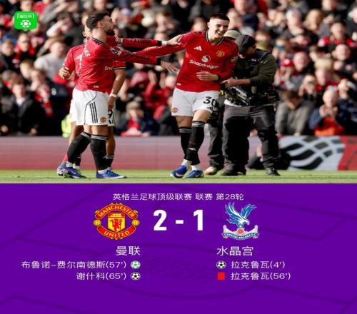 北京时间3月1日,英超联赛第28轮,曼联坐镇主场迎战水晶宫。上半场,拉克鲁瓦开场4分钟头球破门,卢克-肖受伤被马兹拉维换下,B费任意球攻门制造威胁;下半场,库尼亚制造红点套餐,拉克鲁瓦送点又被罚下,B费点射扳平比分,随后B费又助攻谢什科头球破门完成反超。最终,曼联2-1逆转战胜10人水晶宫。