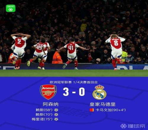 北京时间4月9日,阿森纳坐镇酋长球场迎战皇家马德里。上半场帕尔特伊远射被扑,姆巴佩单刀打高,随后姆巴佩打门被拉亚扑出,赖斯和马丁内利打门被库尔图瓦神勇扑出,下半场赖斯神级任意球破门,库尔图瓦屡次扑救救险,赖斯天外飞仙任意球梅开二度,梅里诺兜射死角锁定胜局,卡马文加两黄变一红被罚下。最终比分阿森纳3-0皇马。