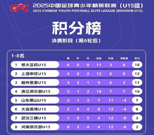 值得一提的是,2025年中青赛U15组比赛的最终排行榜(下图)中,申花U15排名第二,梅州客家U15第三,浙江队U15第四,山东泰山U15第五,大连英博U15第六,武汉三镇U15第七,河南队U15第八。