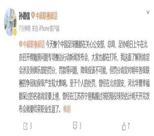 媒体人孙德信在个人社交账号上发文称,其了解到此次发布会肯定会涉及到俱乐部的罚分、罚款等问题,但降级应该不太可能。其还认为,罚分肯定对明年各级联赛的争冠和保级产生较大影响。