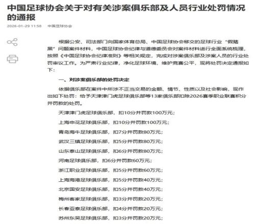 足协通报对13家涉案俱乐部处罚详情:天津津门虎和上海申花被扣10分并罚款100万