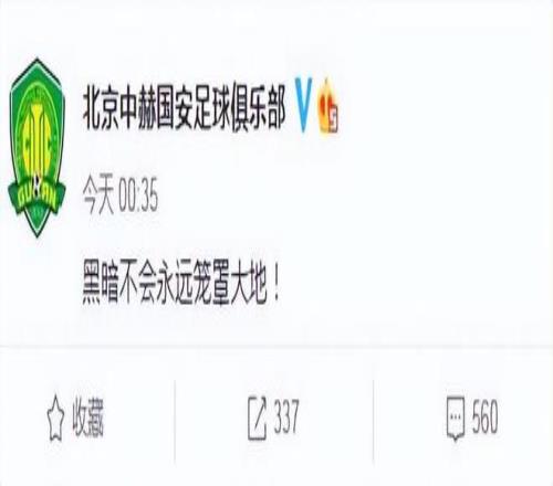 20年中超第11轮比赛中,北京国安因不服主裁判的判罚,赛后在媒体上发文“黑暗不会永远笼罩大地”的抗议声明。