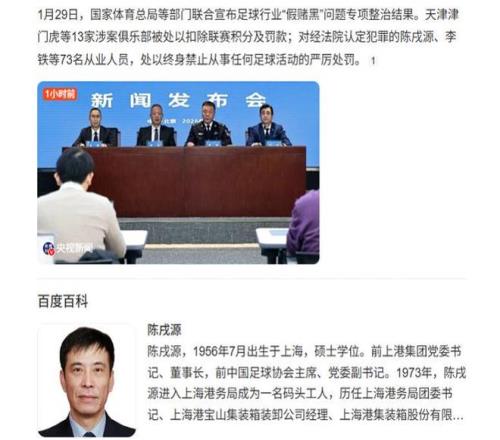 并且,发言人在会上通报,根据相关规定,对于李铁、陈戌源等七十余人给予终身禁止从事任何与足球有关活动的处罚。