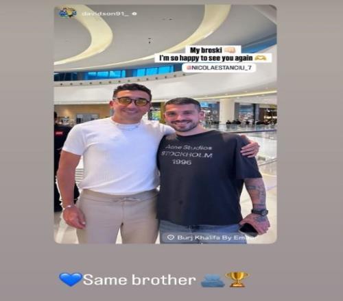 正在迪拜冬训的大连英博外援斯坦丘晒与原武汉三镇队友戴维森、阿齐兹合照。