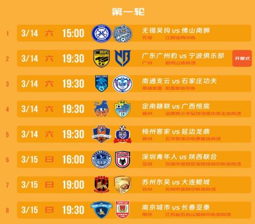 3月15日将展开首轮其他3场较量:明显补强,具备冲超实力的深圳青年人,将与另一支冲超热门陕西联合上演遭遇战。另外,苏州东吴与大连鲲城展开对话,另一支江苏球队南京城市,则与刚降到中甲的长春亚泰狭路相逢。