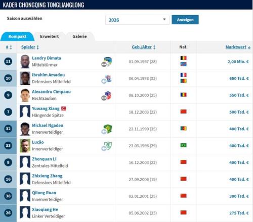重庆铜梁龙外援只有迪马塔身价达到了200万欧元。网站截图
