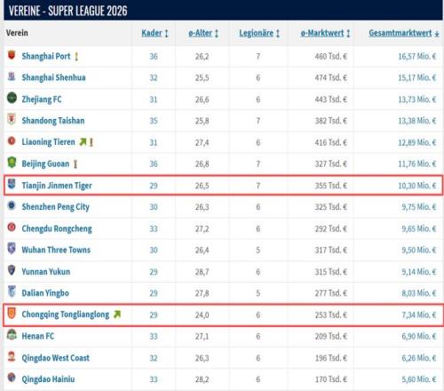 “德国转会市场”网站显示重庆铜梁龙全队身价比天津津门虎低了近300万欧元。网站截图