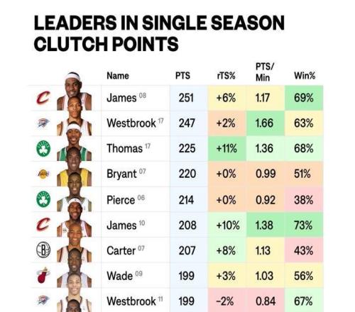 历史单赛季关键时刻得分榜:2008赛季詹姆斯第一!前十没库里!