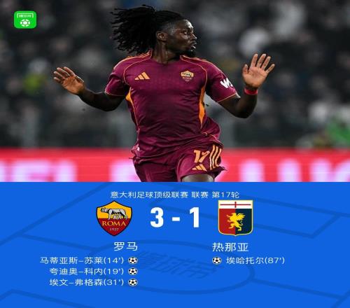 北京时间12月30日,意大利足球顶级联赛第17轮,罗马坐镇主场迎战热那亚。比赛中,马蒂亚斯-苏莱率先打破僵局,为罗...
