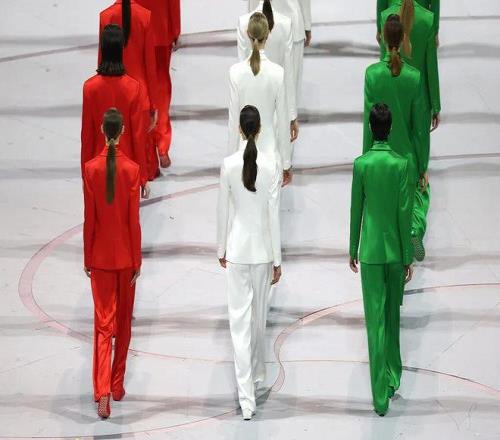 为致敬去年离世的国宝级设计师乔治·阿玛尼,开幕式特别安排了一场流动的时尚盛宴——60名超模身着阿玛尼设计的红、白、绿三色套装列队入场,拼出巨幅意大利国旗。压轴超模维多利亚·切雷蒂(Vittoria Ceretti)手捧国旗,身穿一袭纯白色阿玛尼礼服优雅登场,向大师致敬。