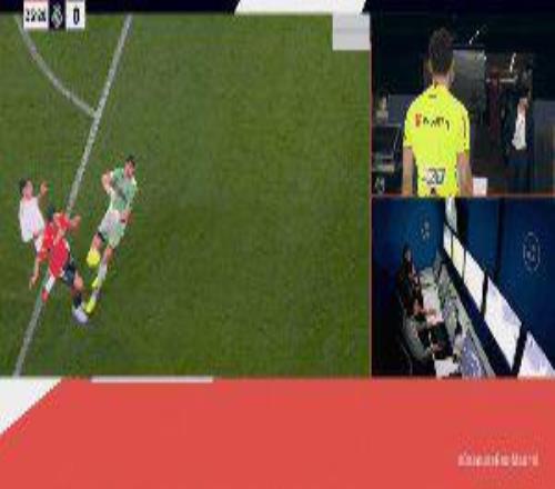 38’ 布迪米尔禁区内被库尔图瓦放倒,主裁起初判罚布迪米尔假摔,VAR随后介入,主裁在观看录像后改判点球。