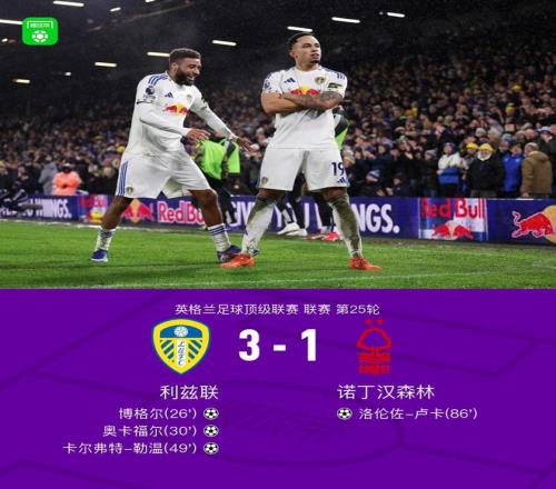 北京时间2月7日英格兰足球顶级联赛 联赛 第25轮,利兹联主场对阵诺丁汉森林。利兹联博格尔破门,奥卡福尔破门,卡尔弗特-勒温破门。诺丁汉森林洛伦佐-卢卡破门。最终比分利兹联 3-1 诺丁汉森林。