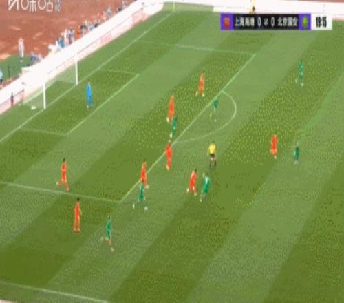 比赛进行到上半场第19分钟时,北京国安进攻到海港禁区右侧,杨立瑜想过杨希却失败,后者解围时皮球遭另一国安球员李磊的拦截,但李磊停球过大被附近的安佩姆抢先把球趟走。这安佩姆的速度太快了!只见过把球趟起来对手球员根本拦不住(下图)。
