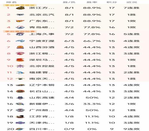 北京时间1月3日,CBA常规赛第9轮的赛事已经全部结束,目前已经没有球队保持全胜的金身了,广厦、北京和广东都是8胜1负处于第一集团,青岛和上海7胜2负,宁波6胜3负暂列第6。8支球队的战绩都是4胜5负,分别是山西、浙江稠州、深圳、北控、福建、南京、辽宁和吉林。山东4胜4负暂列第15名,新疆3胜6负第16名,广州4胜4负第17名,江苏和天津都是1胜8负,四川0胜9负垫底。