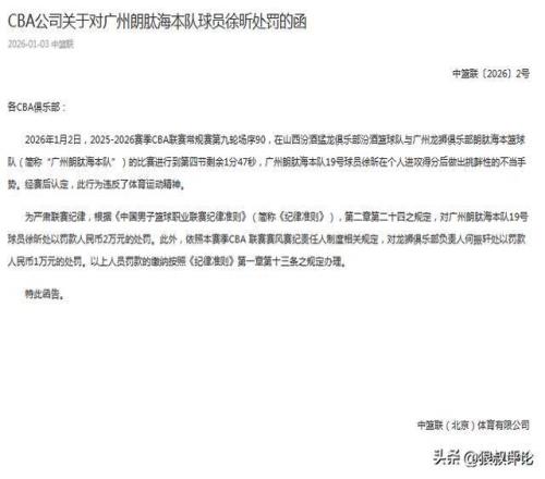 北京时间1月3日,CBA官方公示罚单,广州客场击败山西的比赛当中,徐昕在个人进攻得分后做出挑衅性的不当手势。经赛后认定,此行为违反了体育运动精神, 处以罚款人民币2万元的处罚。