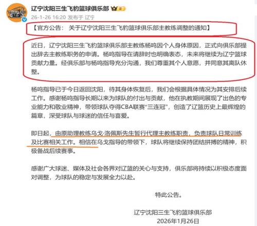 辽篮官宣:杨鸣身体原因辞职充分沟通尊重个人意愿乌戈接任