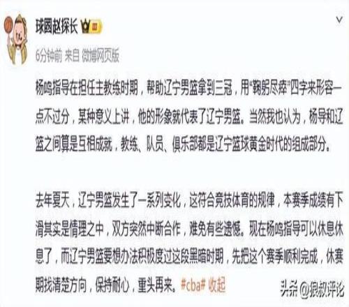 去年夏天,辽宁男篮发生了一系列变化,这符合竞技体育的规律,本赛季成绩有下滑其实是情理之中,双方突然中断合作,难免有些遗憾。现在杨鸣指导可以休息休息了,而辽宁男篮要想办法积极度过这段黑暗时期,先把这个赛季顺利完成,休赛期找清楚方向,保持耐心,重头再来。