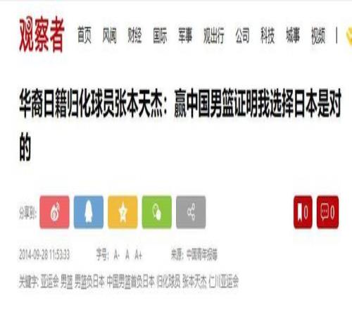 观察者网:华裔日籍归化球员张本天杰:赢中国男篮证明我选择日本是对的