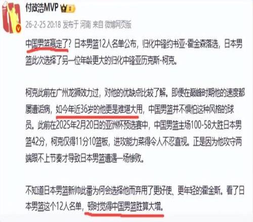 球迷也几乎一致看衰郭士强,看衰中国男篮,他们认为中国队会大概率不敌日本队。然而昨天日本队的大名单出来后,名记付政浩却表示非常乐观,他认为中国男篮胜算大增,甚至说中国队赢定了。虽然他打了一个问号,实际最后下的结论是中国队能够战胜日本队。